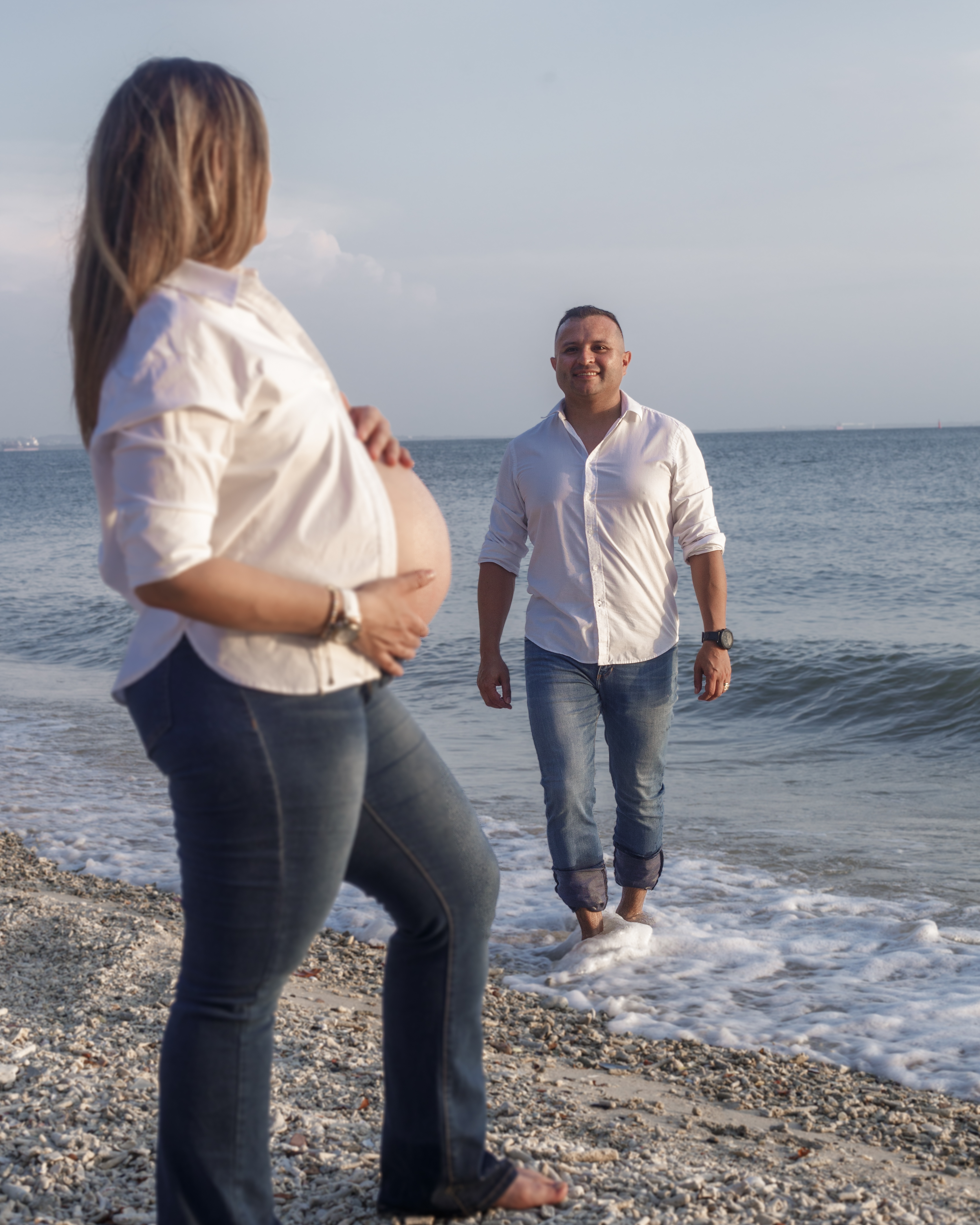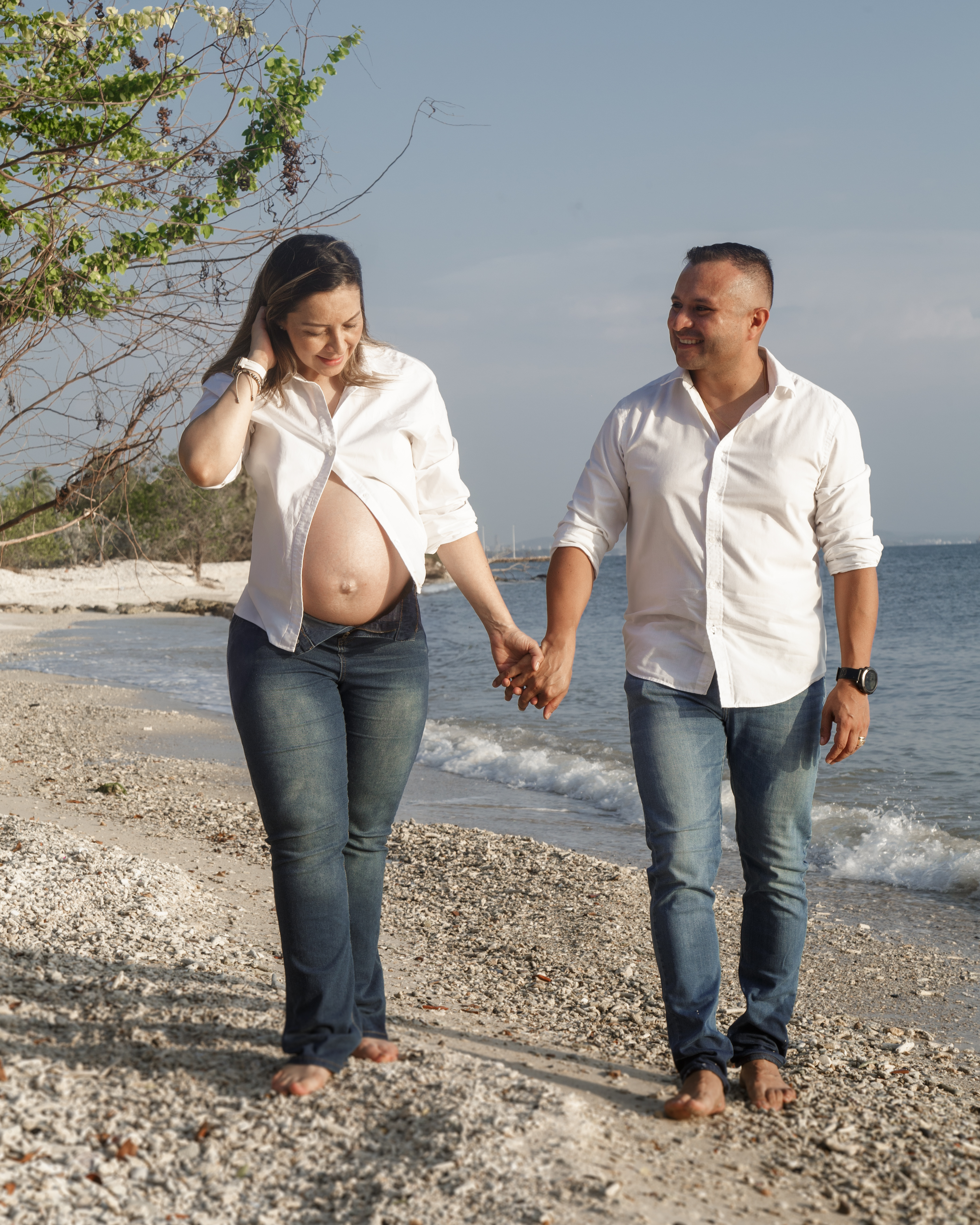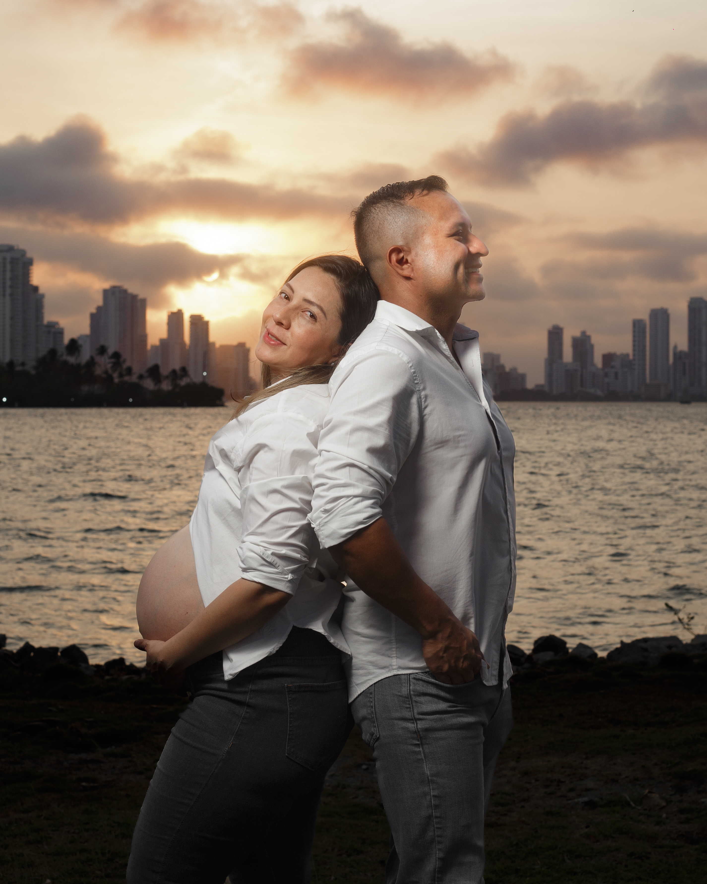 En cuanto a la hora del día, mis sesiones de maternidad en Cartagena siempre son al atardecer. La luz dorada del Caribe entre las 4:30 y 5:30 PM es simplemente perfecta — cálida, suave y con ese brillo que hace que tu piel se vea radiante.