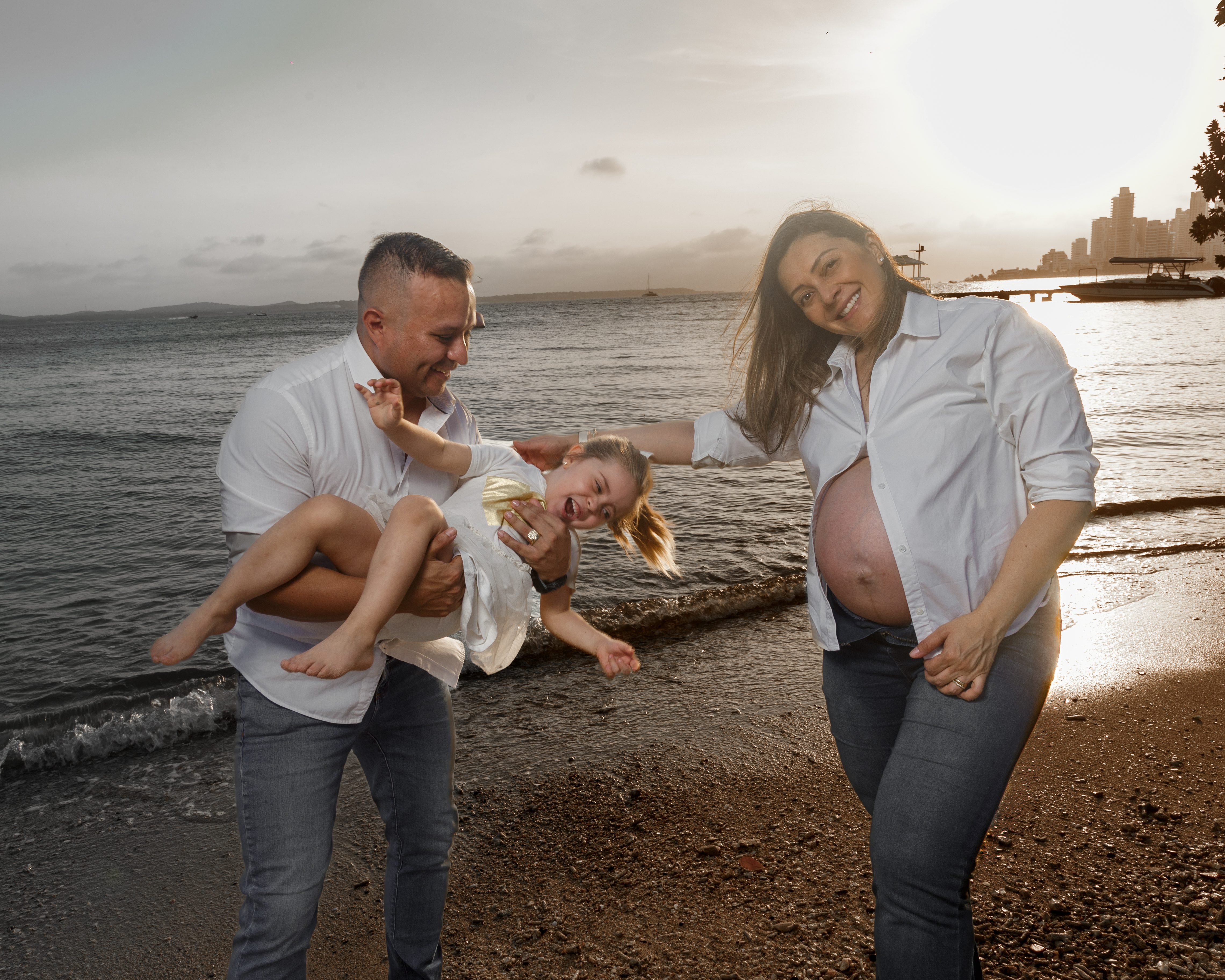 Mis sesiones de maternidad en Cartagena son en exteriores, aprovechando la luz natural del Caribe: la playa al atardecer, las calles del Centro Histórico, los parques, las murallas. Cartagena le da a cada sesión una atmósfera cálida y mágica que ningún estudio puede replicar.